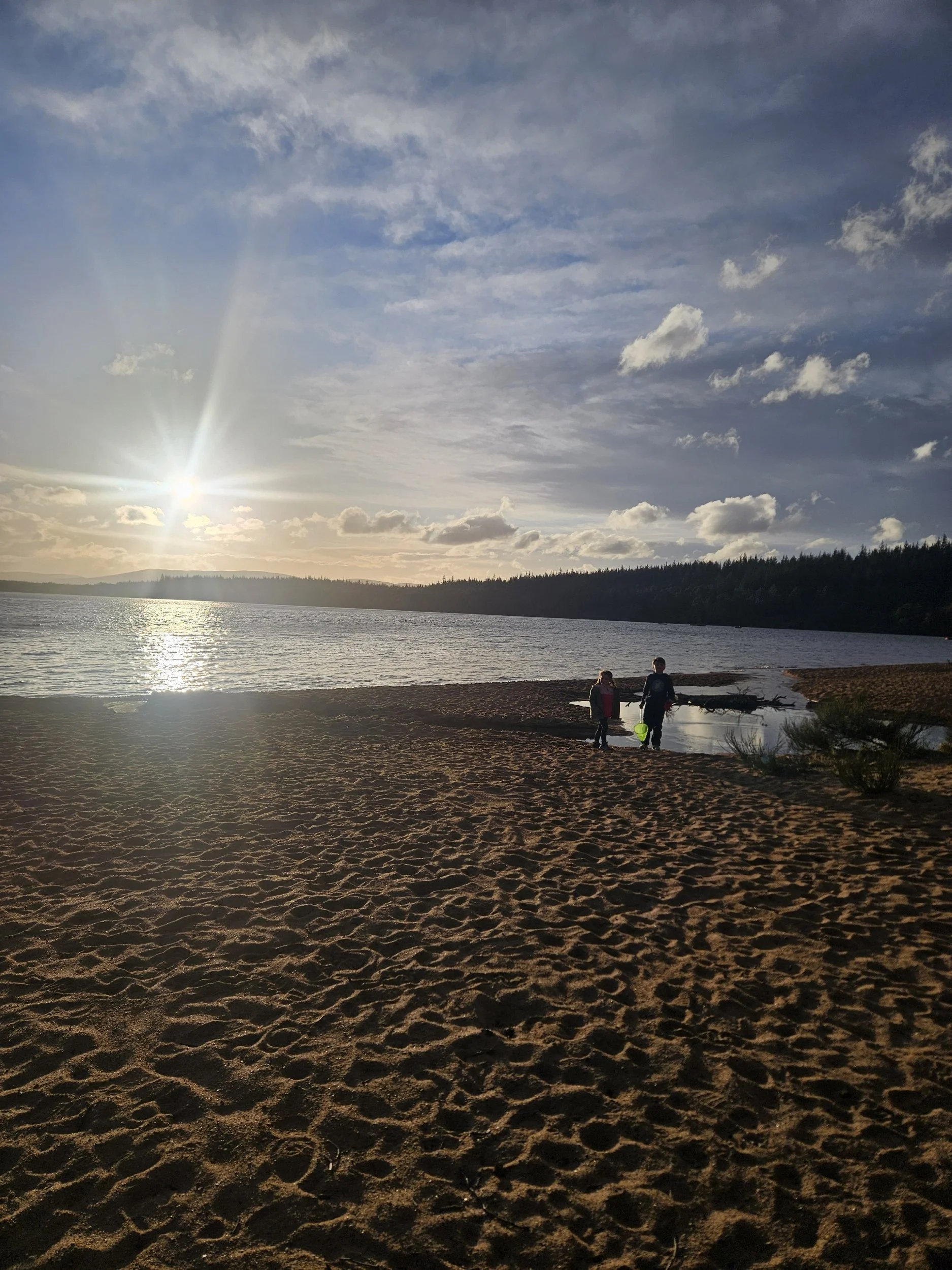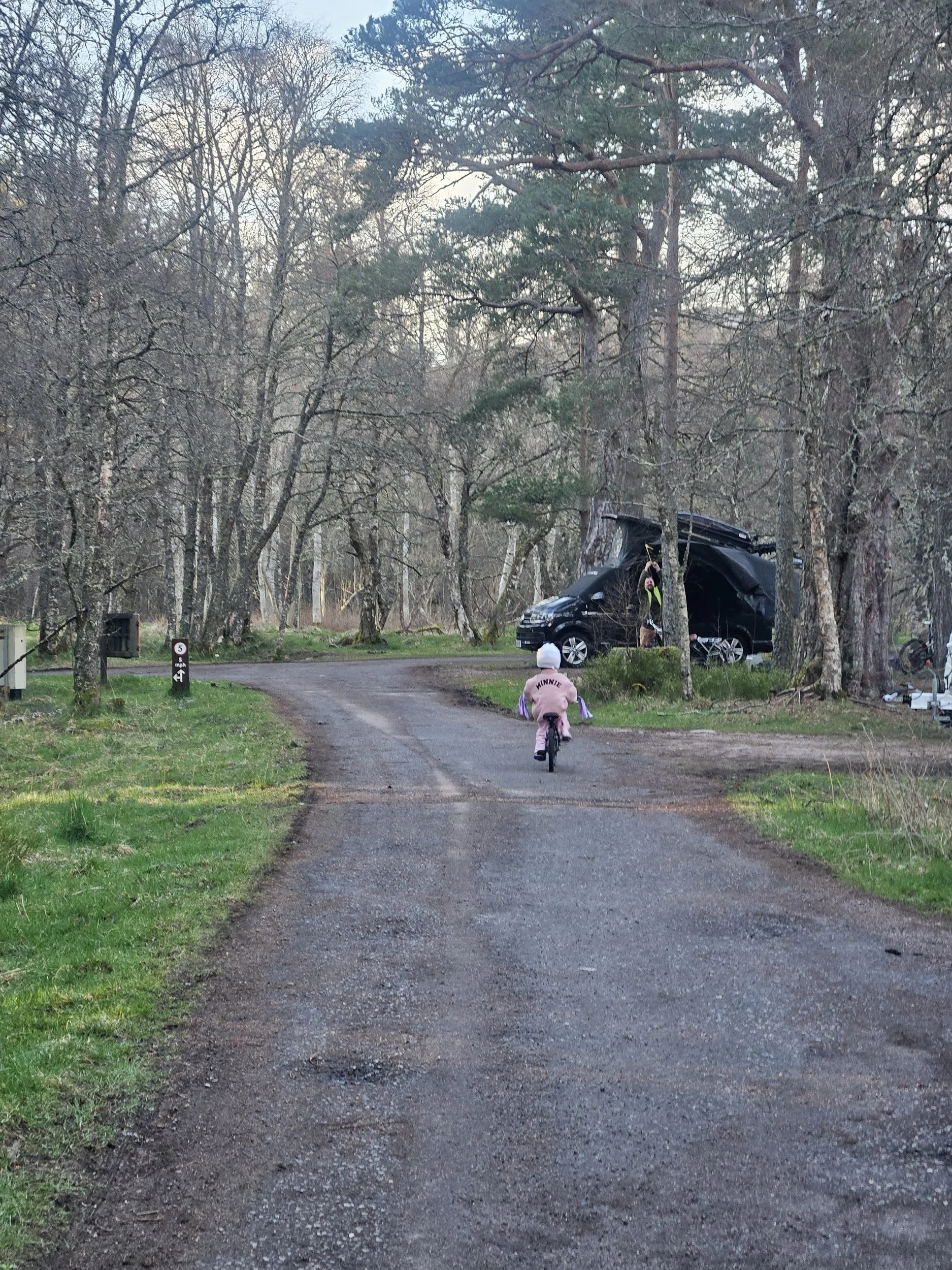 We wanted to catch the last of the snowboarding season in Scotland, so we headed north after the Easter weekend. It proved to be a smart choice — there were fewer campers and much smaller crowds. We drove up to Aviemore, took a right at the roundabout, passing High Range Campsite, another of our favourites, and continued up the winding mountain road. On the right, about 300 m above sea level and tucked away between the pines of Glenmore Forest Park, sits Glenmore Campsite. The site offers 206 pitches that are suitable for tents, caravans and motorhomes. We reserved a sandy pitch on the tree line, with a lovely view of Loch Morlich framed by the trees. The kids ran straight to the loch, where, from the water’s edge, they could enjoy panoramic views of the surrounding mountains.