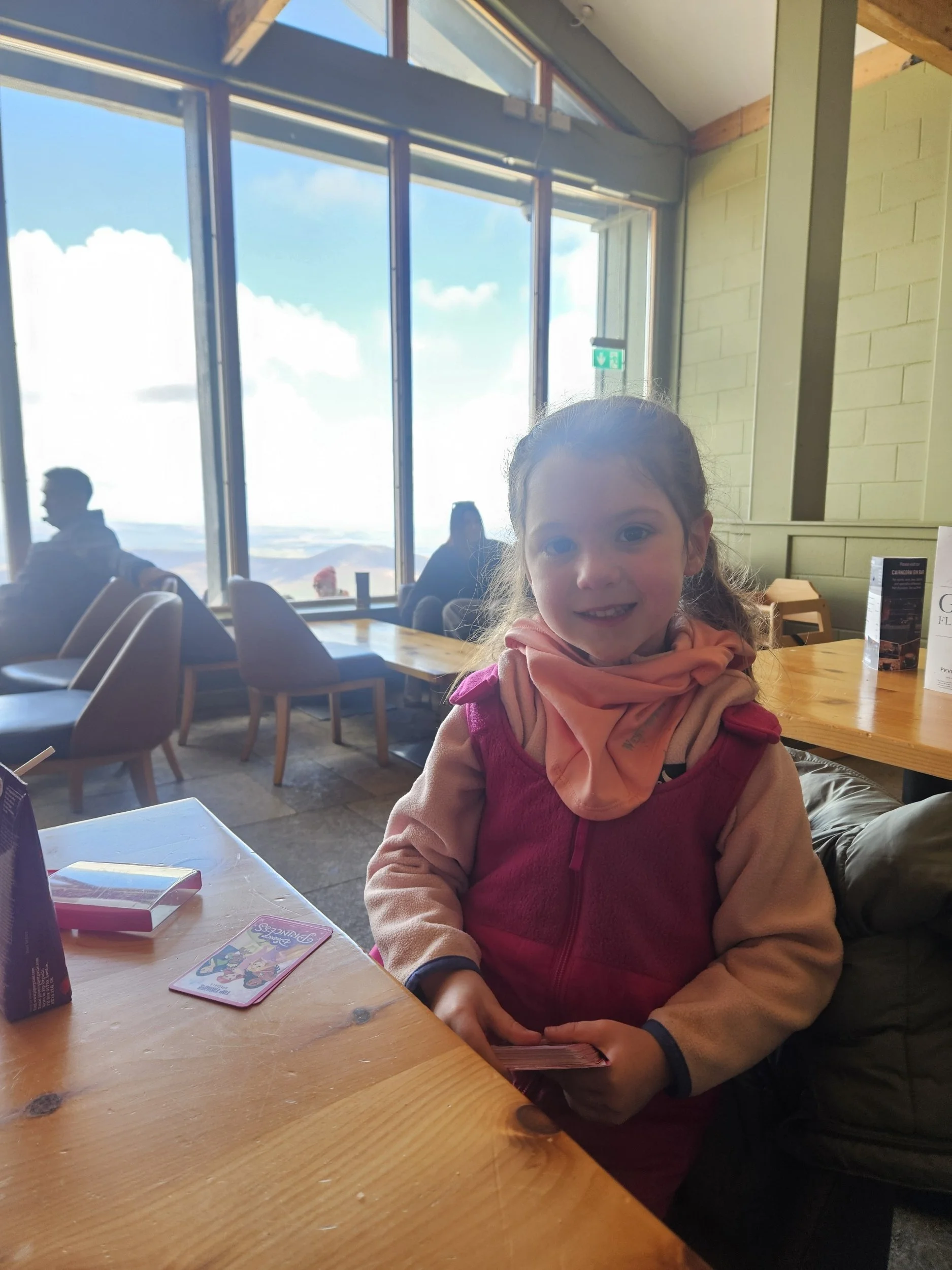 We had a great first day snowboarding from the top down to the mid station, with the railway making convenient mid‑station stops. Esme had some fun at the summit of the mountain, even though the slopes were rather steep for her to practise on. Sam enjoyed several full runs, and we took it in turns to stay with Esme, either up on the top slopes or in the Ptarmigan Station. At the Ptarmigan Top Station you will find the UK’s highest restaurant and the Cairngorm Gin Bar, both offering panoramic views across Strathspey. We made ourselves comfy near the bar for a relaxed lunch, including soup of the day, macaroni cheese and homemade chips. Esme enjoyed playing a few card games while the boys squeezed in a few more runs on the slopes. Accessed directly from the bar is the outdoor viewing terrace, perfect for photographs. On the lower levels you’ll find the Shop at the Top, which offers a wide range of gifts, clothing and local products, along with the Cairngorm interactive zone — complete with sand pits and projected games — and the immersive 270° “Cairngorm Story” exhibition.