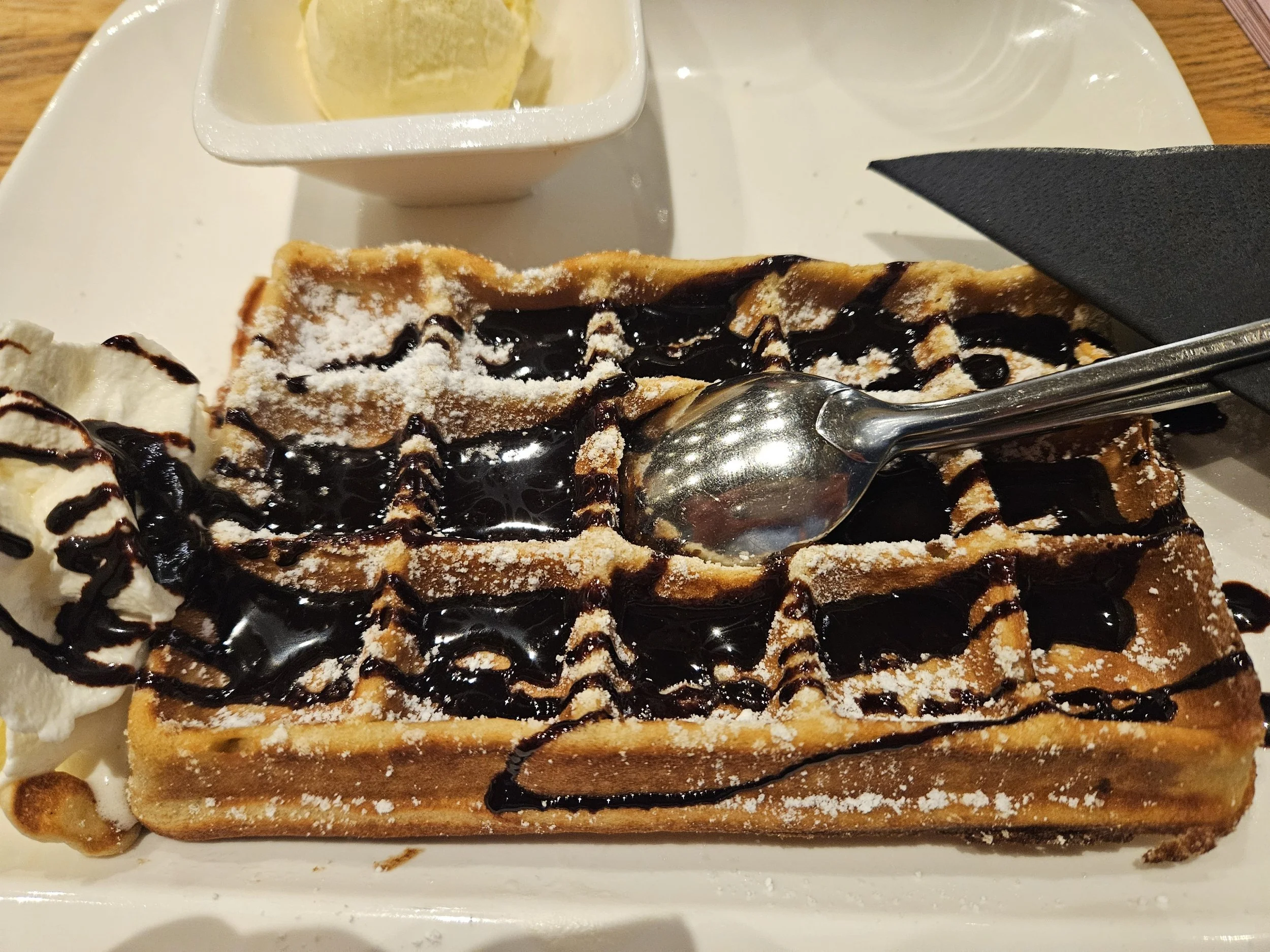 Even though we were completely stuffed from the delicious food we had just enjoyed, the server skillfully persuaded us to try a dessert. We ordered a waffle topped with rich chocolate sauce, and it was definitely the best I’ve ever had! It was truly well worth the visit, and it beautifully ended our last night at the campsite.